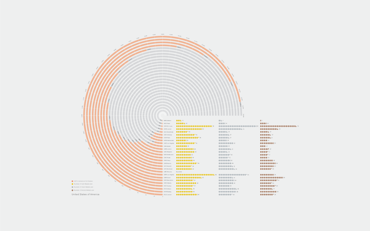 An infographic was made to analyze if there was a correlation between a country's GDP and their Olympics medal count. Data was collected for the three competing nations of the 2012 Olympics: The United States, China, and Great Britain. The medal count for each Olympic year and their respective GDP's were documented, and the GDP numbers were adjusted for currency differences.
