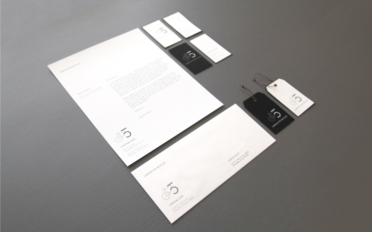 A letter and symbol were combined to create a basis for a logo. A business and identity were developed in accordance with the logo. The symbol developed merged aspects of a 5, C, and -. The business developed was named Carbon Five Bicycles.