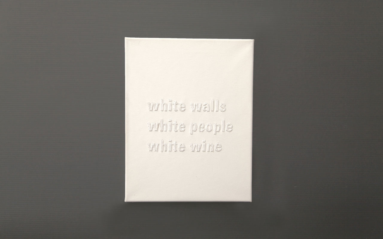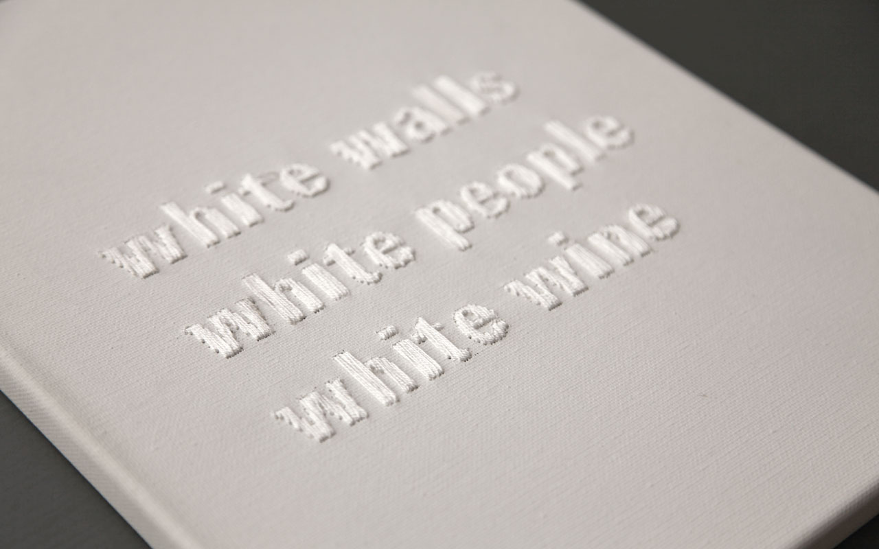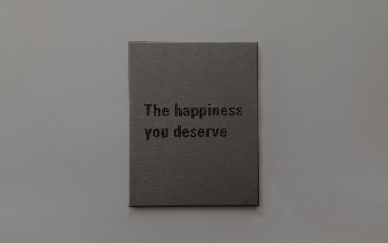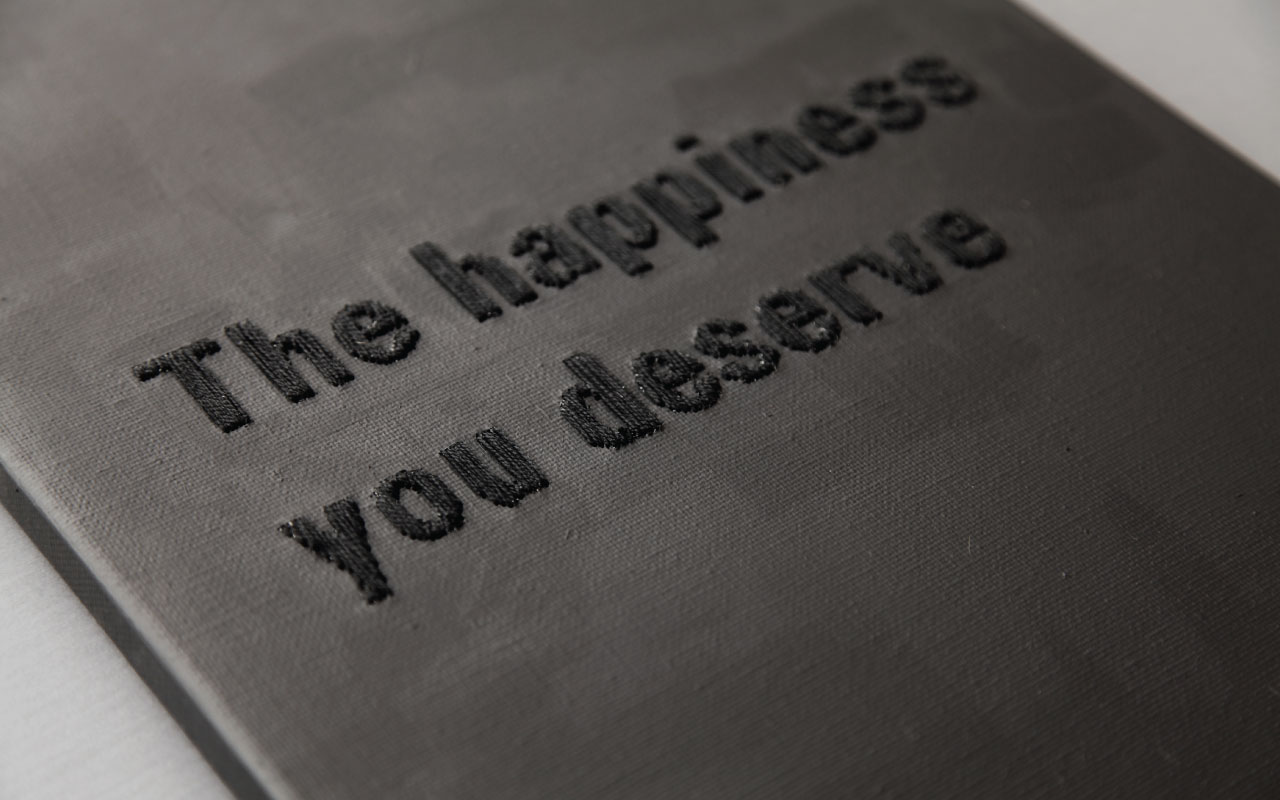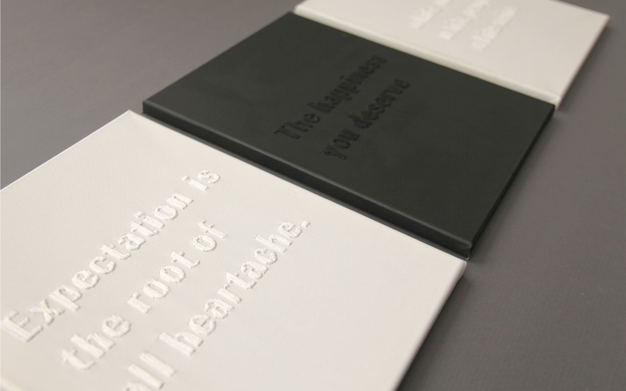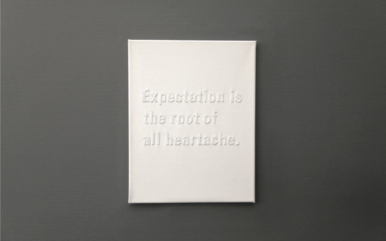 Typography is hand stitched onto canvas with matching colors. The text are "hidden" truths that are revealed through experience or toil.